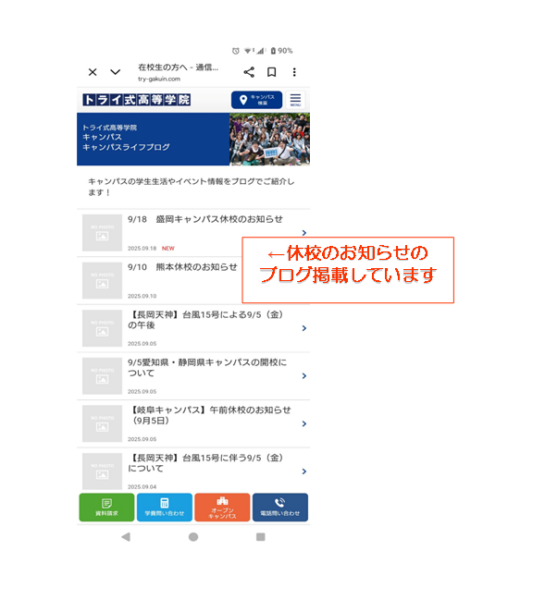 天候や災害などによる休校の場合には、トライ式高等学院ホームページの「在校生の方へ」のブログにお知らせが掲載されます。
