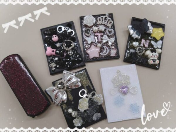ミラーデコは、鏡の側面にネイル用の飾りをレジンで固定し、UVライトで硬化させます。