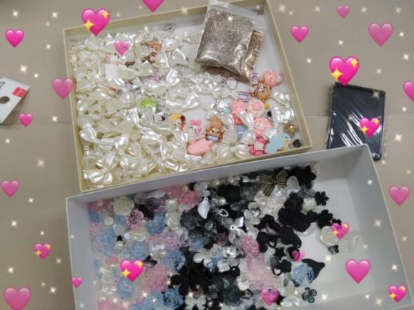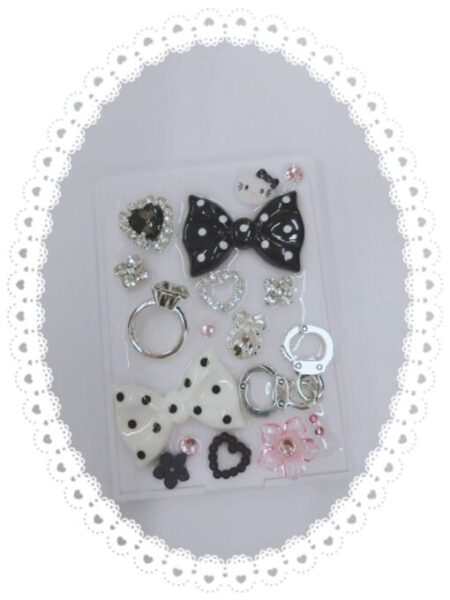 小さなストーンやハート、リボンのパーツを並べてレジンで固定します。