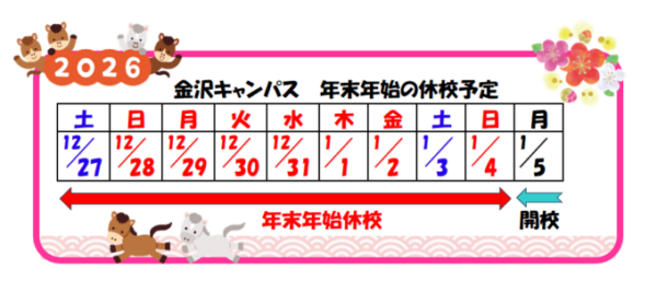 休校期間 2025年12月27日(土)〜 2026年1月4日(日)