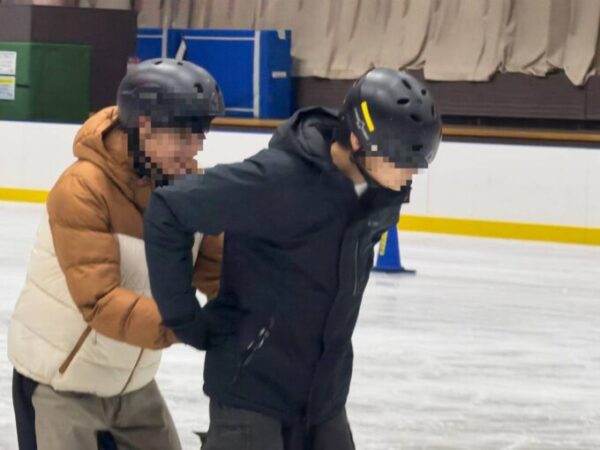 滑れる生徒が、初心者の生徒の横についてコツを教える姿や