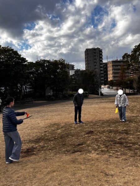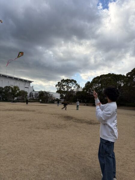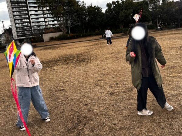 途中から、公園を利用していた小学生たちも隣で遊びに加わり、みんなで凧揚げを楽しむ場面も見られました🤗