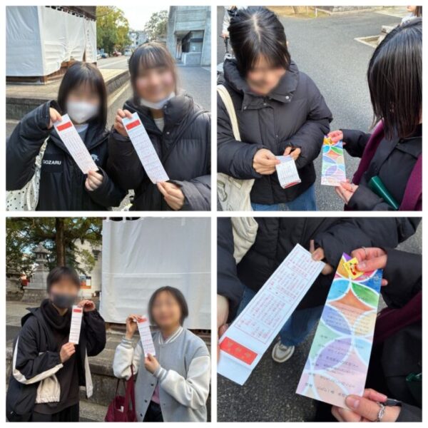 最後にお楽しみのおみくじを引きました。大吉、中吉、吉、小吉、末吉とみんな様々。カラフルなかわいいおみくじもありました。おみくじを結ぶ子もいれば、持ち帰る子もいました。