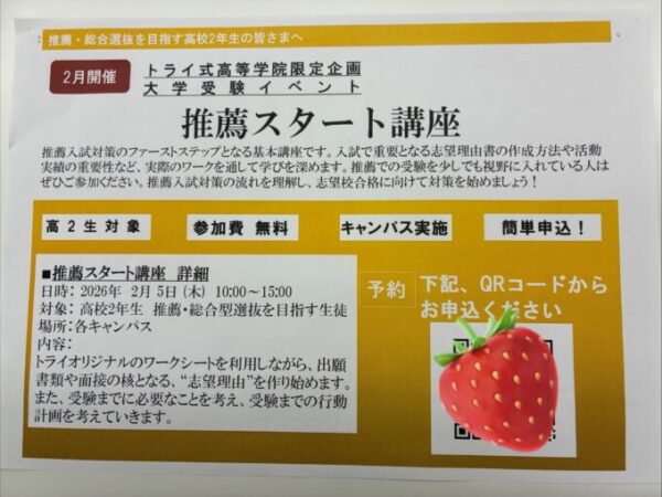 そんな中トライ式高等学院では、推薦・総合選抜を目指している高校2年生向けに、オンラインイベント『推薦スタート講座』を全国一斉で行います‼️このイベントは、トライ式高等学院限定企画で、大学受験のスタートイベントなので、4月から受験生になる高2生必見です‼️‼️