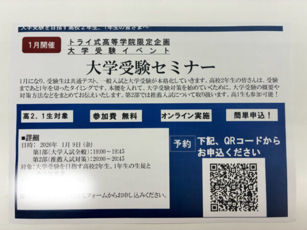 いよいよ共通テストが始まり、大学受験が本格化しますね!!トライ式高等学院では、大学受験する可能性のある高校2年生や1年生対象の大学受験セミナーが開かれました!参加した生徒さんからの感想をいくつか紹介いたします♩