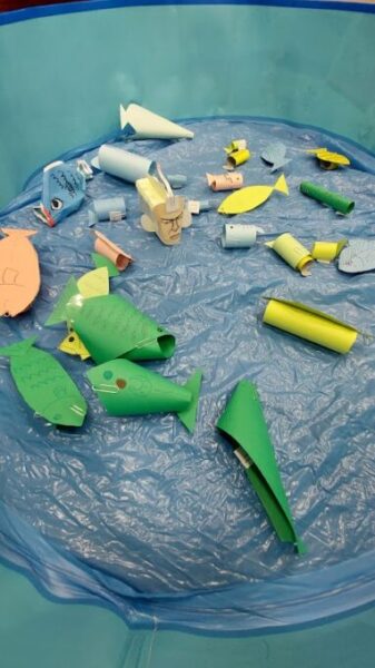 画用紙で作った魚に点数の紙を付け、釣ってもらいます🎣