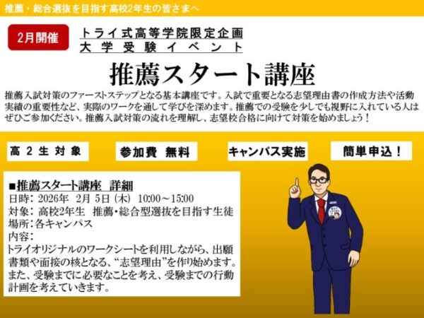 トライ式高等学院では高校2年生の生徒を対象に「推薦スタート講座」を実施します。