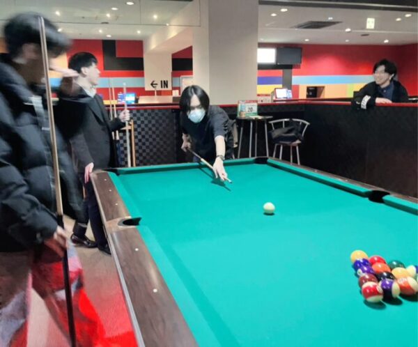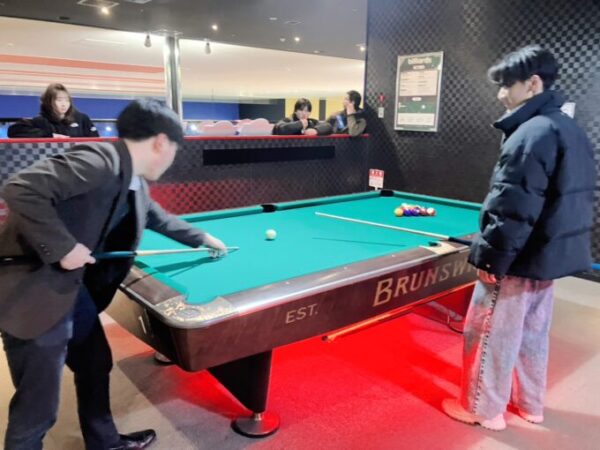 ビリヤードを初めてする生徒さんに、経験者が打ち方を教えてあげていました!