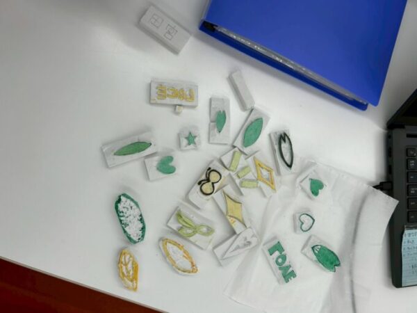最初は、消しゴムを削るが難しいかも。。。思い通りに作れるかな⁈と不安もあり、簡単そうなハート型から!と始めた生徒たち✊掘ってみると、誰もが消しゴムを掘る楽しさにハマっていき、無心に進めていました‼️‼️作っていくうちに、どんどん難しい模様や、反転する文字にも挑戦して楽しい時間になりました(*^-^*)