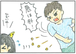 豆を投げるM君。そっちは鬼じゃないよ。
