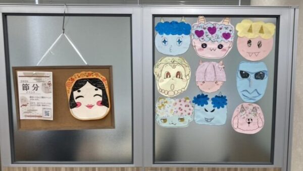 (コルクボードのお面は、鬼ではなく福の神とのことです😊)