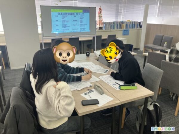 グループになって、お互いの発表を聞いたり、感想を言い合ったり、