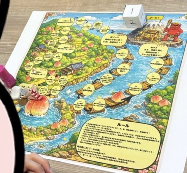このボードゲーム、生徒Aさんの自作なんです😎桃太郎が鬼を倒しに行くゲームなのですが、きびだんごをちゃんと持っていないと犬、猿、雉が仲間になってくれない!桃太郎ぴんち😵