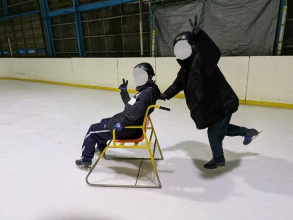 次第に慣れてくると、経験者の生徒から滑るコツを教えてもらったり、補助具を使ったりしながら、楽しく滑りました🎵