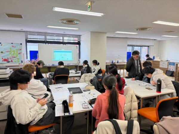 全国一斉開始のため、プロジェクターで講習を映して、それを聞きながらワークシートに記入していきます。キャンパスではスタッフや高3生が随時、机間指導を行いサポートします。