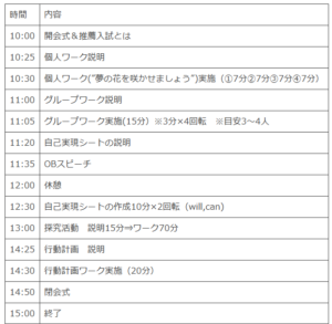 個人ワークでは、進路の決まっている生徒さんや、まだやりたいことが決まっていない生徒さん、様々でしたが、将来のなりたい自分にむかってこれからやるべきことを順にみんなや先輩のアドバイスをききながら、考えていきました。