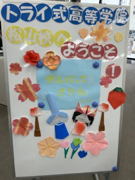 ウェルカムボードやキャンパス内に飾られると、すっかり春の装いになりあたたかい空間になりました✨