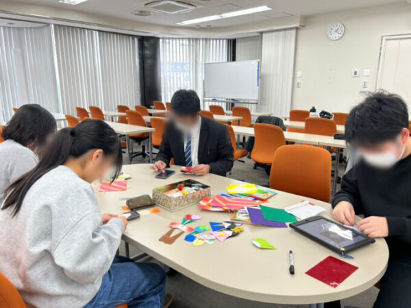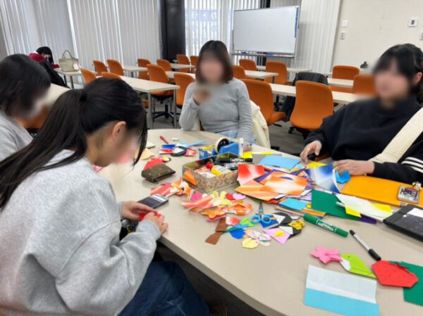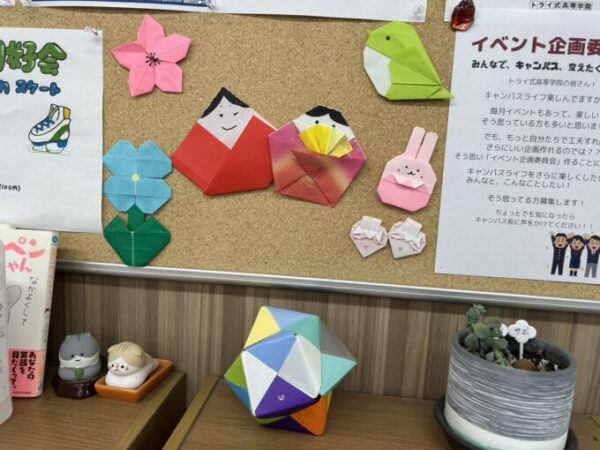 生徒のみんなは3月をテーマに話し合いながら折り紙でお内裏様やお雛様、