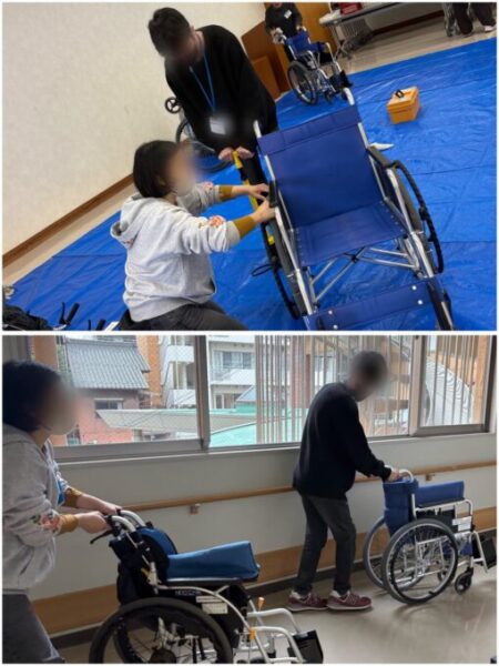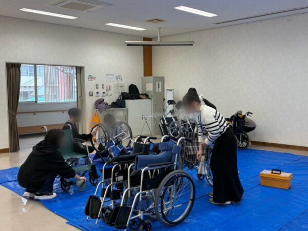 内容としては、水拭きしたり、タイヤの空気を補充したりしました。教えてくださった地域の方と協力しながら作業を効率よくこなしていきました!今回はメンテナンスする車椅子が少なかったようで、あっという間に終わってしまいました👏👏