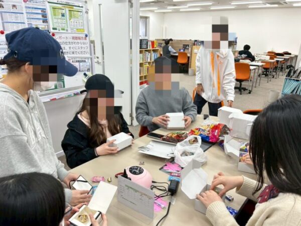 バレンタインにちなんで、小さな箱に、チョコレートなどのお菓子を詰め、