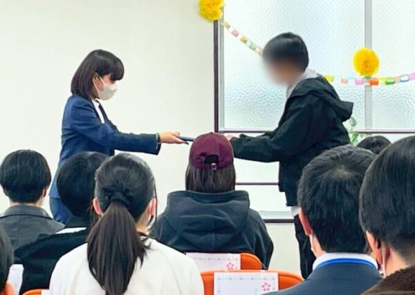 これまでの感謝を込めて盛大な拍手でお迎えし、キャンパス長から卒業証書の授与です。