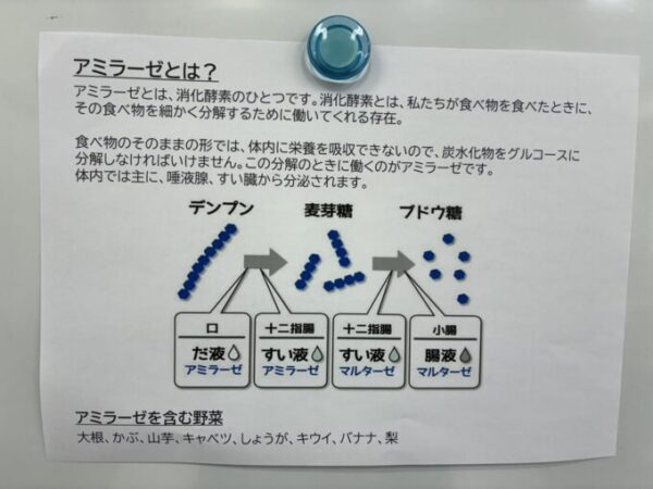 アミラーゼは、消化酵素の一種で、唾液腺や膵臓から分泌され、炭水化物を単糖類や二糖類に分解する役割を持っています。