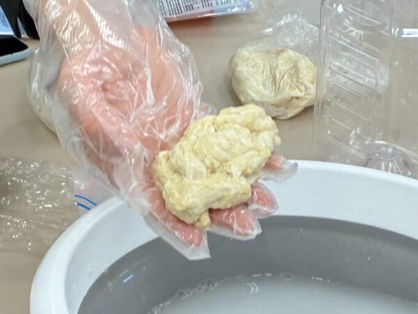 水の入ったボウルの中で、優しくもみ洗いし、白い粉(でんぷん)をこすり取ります。