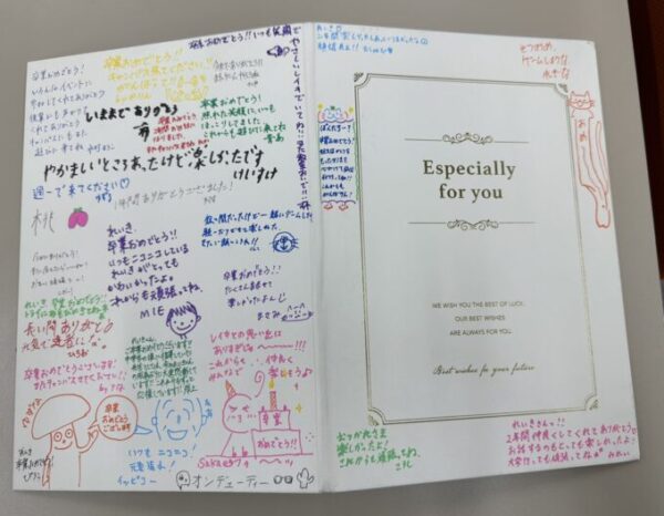 表紙へのメッセージは、友達や先生方に書いてもらったり、貰った3年生はみんな有効活用していました。