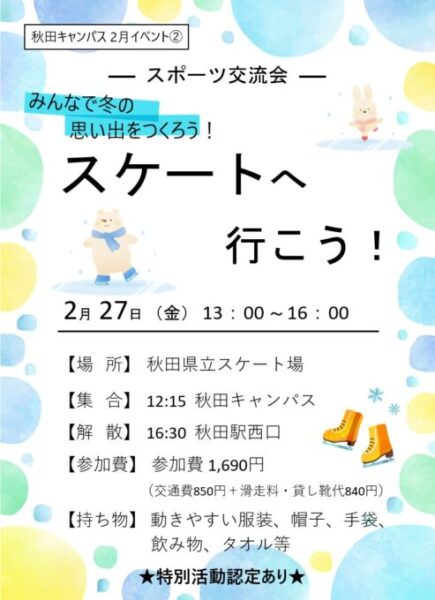 2月27日、秋田キャンパスイベント(特別活動)として、スケートへ行ってきました✨