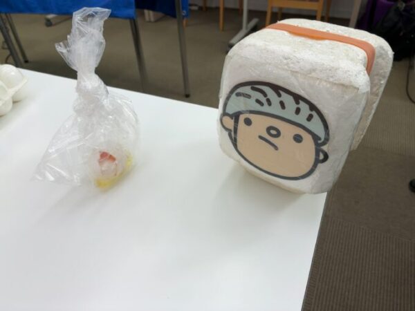 こちらは、ヘルメットを被らず事故にあった場合の頭部へのダメージを、卵を使ったシミュレーションを用い、とても分かりやすく説明して下さいました。