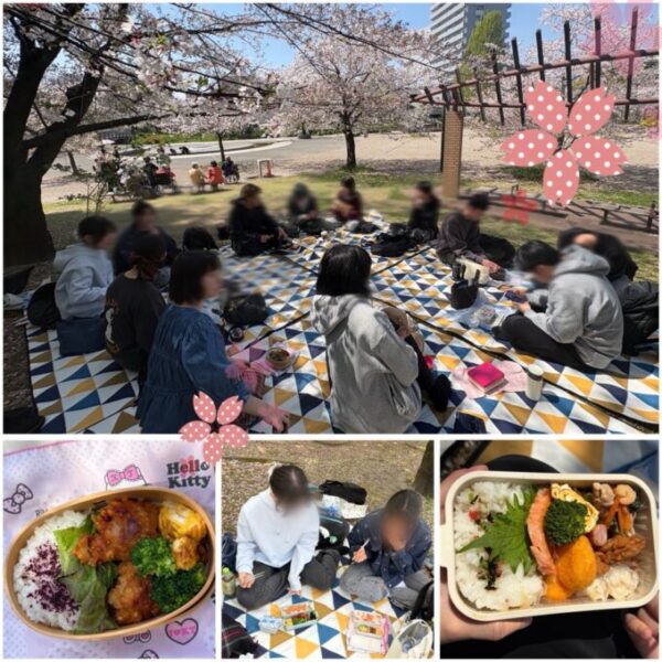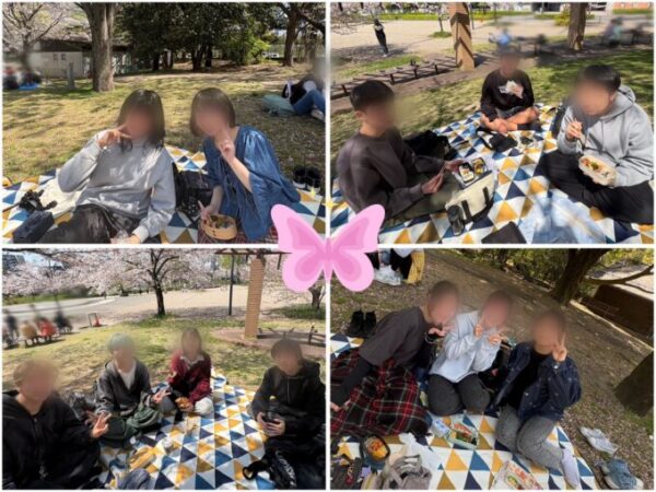 キャンパスで用意した新品のレジャーシートを敷いて、桜の木の下でお昼ご飯を食べました🎵外で食べるといつもより美味しさ倍増ですね😉