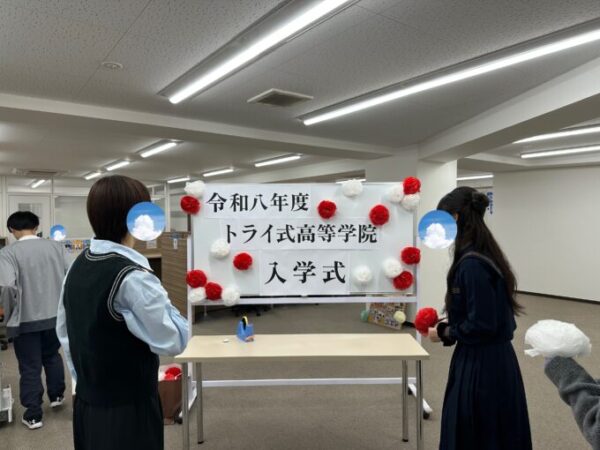 ホワイトボードに【トライ式高等学院 入学式】という文字を貼り、