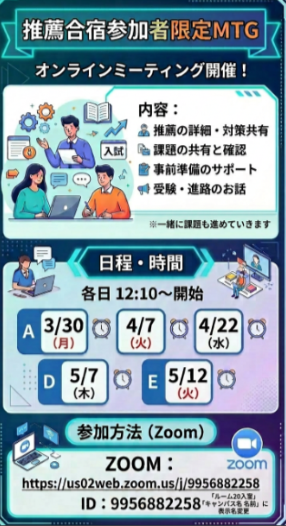 推薦合宿に参加される方は、オンラインミーティングにも参加して