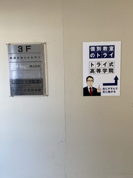 エレベーターを降りると目の前にトライの案内板があります✨右に進んで左に曲がるとすぐ教室が見えますよ~✌