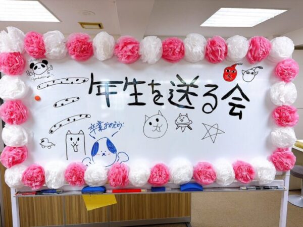 事前に生徒も集まってくれて、お花の飾りを作ってみたりホワイトボードやキャンパスをかわいく飾ってくれました♡