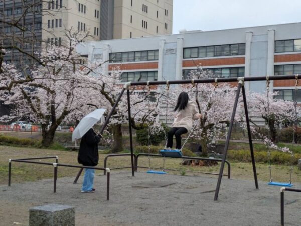 松川周辺にはブランコが設置されており、久しぶりにこいでみる生徒も😯