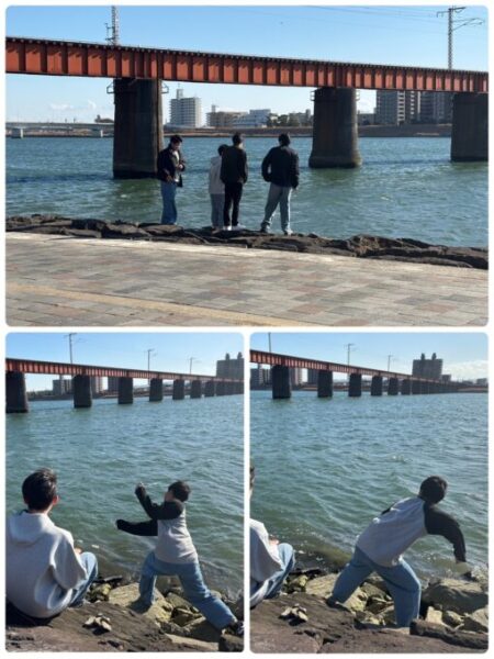川に石を投げて水面を跳ねさせる「水切り(みずきり)」で遊び始めました。