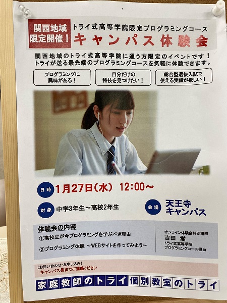 こんにちは。 いつも見て頂き、ありがとうございます。 トライ式高等学院天王寺キャンパスです! プログラミング講座の・・・