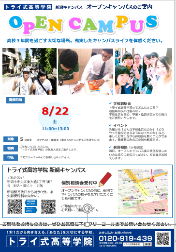 ブログをご覧の皆さんこんにちは トライ式高等学院新潟キャンパスです。 8月のオープンキャンパス日・・・
