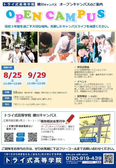 こんにちは!トライ式高等学院、横川キャンパスです。 今回はオープンキャンパスのご案内です。 日時:6・・・