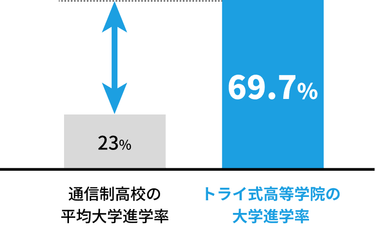 ※大学進学率とは、進路決定者のうちの大学・短大・専門職大学に合格した者において。卒業/大学進学率2024年自社調べ。出典:文部科学省「学校基本調査」在籍生徒数3500人以上の通信制高校・サポート校において進学率全国1位。2023/3/23 産経メディックス調べ。令和4年度の学校基本調査:大学進学率23%